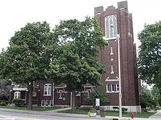 A two-story dark brown brick manse with a hip roof is attached to the church on one side. it is connected internally t o the pastor's study in the main church.[2]