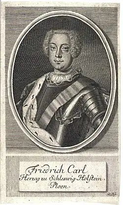 Frederick Charles of Schleswig-Holstein-Sonderburg-Plön (4 August 1706, in Sønderborg – 18–19 October 1761, in Traventhal), known as Friedrich Karl or Friedrik Carl of Holstein-Plön, was a member of a cadet branch of the Danish royal family and the last duke of the Duchy of Schleswig-Holstein-Sonderburg-Plön (or Holstein-Plön), a Danish royal prince, and a knight of the Order of the Elephant. When he died without a male heir born of his marriage to Countess Christine Armgard von Reventlow, rule of the Duchy of Holstein-Plön returned to the Danish crown.