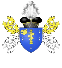 The said 'marks of the specific rank or function' as used by Barons and Counts depended on the rank or function held by the individual. Military barons and counts had a sword on their quarter, members of the Conseil d'Etat had a chequy, ministers had a lion's head, prefects had a wall beneath an oak branch, mayors had a wall, landowners had a wheat stalk, judges had a balance, members of Academies had a palm, etc.[2]