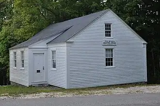 The Friends Meetinghouse is located in a rural area of central Casco, on the west side of Quaker Ridge Road, about 0.75 miles (1.21 km) south of Maine State Route 11. It is a modest single-story wood-frame structure, with a gable roof and narrow clapboard siding. A shed-roofed entrance vestibule projects from the left side of the building, its roof extending from roughly the midpoint of the main roof slope. The front facade has single sash windows at the main and attic levels. The interior of the main space is divided roughly in two, with a fixed partition wall that has openable shutters on its upper half; this was so that the sexes would be divided, according to Quaker custom, while allowing communication between the sides to take place. The space is furnished with high-backed bench pews and a small parlor organ.[2]