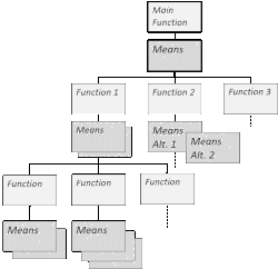 In addition to product level requirements, there might be requirements on sub functions that may be a consequence of means at a higher level. The function means tree is a tool that can aid in the creative part of the design process. It can also be a tool for mapping requirements to parts in a design.
