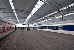 Fuyang Station has 5 passenger platforms and 15 train tracks, including 2 main line tracks, 9 platform tracks, 3 cargo train service tracks and 1 shared passenger-cargo track, and the Fuhuai railway track is outside of the station. The station is covered by a 56,000-square-meter columness-less canopy. The station building and the platforms are connected by a 12-meter-wide overpass for inbound passenger, two tunnels for outbound passengers and a baggage passage.[11][12] The station is also equipped with facilities such as a turnaround section for train maintenance service and a passenger train preparation facility.[5]