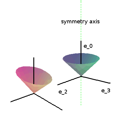 Examining the frame above, we can see that the coordinate is inessential; our spacetime is the direct product of a factor R with a signature −++ three-manifold. Suppressing in order to focus our attention on this three-manifold, let us examine how the appearance of the light cones changes as we travel out from the axis of symmetry :
