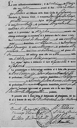 D'Annunzio was born in the township of Pescara, in the modern-day Italian region of Abruzzo, the son of a wealthy landowner and mayor of the town, Francesco Paolo Rapagnetta D'Annunzio (1838–1893) and his wife Luisa de Benedictis (1839–1917). His father was born Francesco Paolo Rapagnetta, the sixth child of Camillo Rapagnetta, a shoemaker, and Rita Olimpia Lolli. At the age of 13, he was adopted by a sister of his mother Rita, Anna Lolli, who had remarried, after the death of her first husband, a wealthy merchant and shipowner, Antonio D'Annunzio.[9][10] D'Annunzio's paternal grandfather, Camillo Rapagnetta (1795–1866) registered his birth. Legend has it that D'Annunzio was initially baptised Gaetano and given the name of Gabriele later in childhood because of his angelic looks;[11] this story is purely fictitious, as can be seen by D'Annunzio's birth certificate and baptismal records, which record Gabriele as both his birth and baptismal name.[12][nb 1]