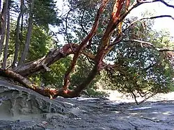The Southern Gulf Islands consist mainly of former seabed sediments crumpled and gradually thrust upward by tectonic plate movement approximately 55 to 42 million years ago.[21] Subsequent periods of glaciation scraped away topsoil and some of the bedrock. During the peak of the Fraser Glaciation, 30,000 to 11,000 years ago, Gabriola was covered with ice up to 2 kilometres (1.2 mi) thick.[22] Though melting glaciers left deposits of sand, gravel, and boulders, the main rocks exposed on Gabriola's surface are sandstone and shale. Differential erosion of relatively soft shales and relatively hard sandstones helped create cliffs, points, and bays along Gabriola's shoreline.[22]