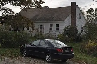 The Garber House stands on more than 56 acres (23 ha) in rural southern Goshen, on the west side of Lempster Coach Road, about 0.25 miles (0.40 km) south of its junction with New Hampshire Route 31. It is a 1+1⁄2-story wooden structure, with a gabled roof, clapboarded exterior, and central chimney.[2] The walls are formed out of vertically oriented wooden planking which is three inches think, with lateral stability provided by wooden dowels.[3] It is five bays wide, with the center entrance flanked by sash windows. The entry has sidelight windows, and originally had a more elaborate Greek Revival framing. An ell, possibly once a small barn, extends to the west of the main block at a recess, with a covered porch in front.[2]