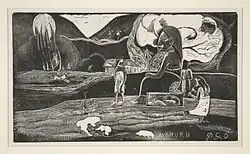 He maintained a horse and trap, so was in a position to travel daily to Papeete to participate in the social life of the colony should he wish. He subscribed to the Mercure de France (indeed was a shareholder), by then France's foremost critical journal, and kept up an active correspondence with fellow artists, dealers, critics, and patrons in Paris.[125] During his year in Papeete and thereafter, he played an increasing role in local politics, contributing abrasively to a local journal opposed to the colonial government, Les Guêpes (The Wasps), that had recently been formed, and eventually edited his own monthly publication Le Sourire: Journal sérieux (The Smile: A Serious Newspaper), later titled simply Journal méchant (A Wicked Newspaper).[126] A certain amount of artwork and woodcuts from his newspaper survive.[127] In February 1900 he became the editor of Les Guêpes itself, for which he drew a salary, and he continued as editor until he left Tahiti in September 1901. The paper under his editorship was noted for its scurrilous attacks on the governor and officialdom in general, but was not in fact a champion of native causes, although perceived as such nevertheless.[128][129]