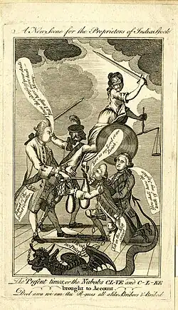 Colebrooke was a full-time director of the East India Company from 1767 to 1771, deputy chairman from 1768 to 1769 and was elected chairman three times, in 1769, 1770 and 1772.[4] His final year in office was a disastrous one: the company got into financial difficulties (which led to the passing of the Regulating Act 1773), he was accused of speculating in its stock while chairman, and was left heavily in debt to a number of the other leading figures in the company, partly through arrangements to procure votes in the company's elections. (In 1771 he, Sir William Pulteney and Sir James Cockburn recruited Paul Wentworth (spy) borrowed £66,000 together from Hope & Co.[4]) He lost much larger sums, however, speculating on raw materials - hemp, flax, lead, logwood and alum, and the fall or rises of the market value of EIC-stocks. In 1771 he lost £190,000 dealing in hemp; from 1772 he was attempting to corner the world's supply of alum, buying up mines in Yorkshire and Lancashire, and saw much of the remainder of his fortune swallowed up when the market collapsed as part of the financial crisis of 1772.[9]