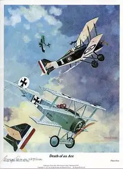 Evans' first love was World War I aviation, and he did many paintings of World War I dogfights, including a calendar for The Cross and Cockade Society. He also did book jacket art. For David Manning White's Marlborough House, Evans created the cover illustration for The Black Swallow of Death: The Incredible Story of Eugene Jacques Bullard, The World's First Black Combat Aviator by P.J. Carisella, James W. Ryan and Edward W. Brooke (1972). This illustration is on display at the National Museum of the United States Air Force near Dayton, Ohio.