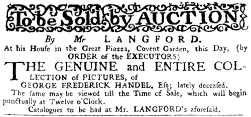 The paintings and prints in Handel's collection (that weren't bequeathed in his will) were auctioned by Abraham Langford[2] a little over ten months after his death (the auction catalogue was dated 27–28 February 1760).[3]