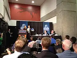 Georgia State's first head coach Bill Curry was the initial architect for the program. His tenure ended with a record of 10–23. Initially hired by the former athletics director Mary McElroy, after her termination by previous Georgia State president Carl Patton, Curry was named interim athletic director while the school searched for a new AD.[51] During his tenure as head coach, Curry saw the program grow from an idea into a fully fledged division I – FCS team. He also was present for the beginning of the transition from the football championship subdivision (FCS) to the football bowl subdivision (FBS) as the school changed athletics conferences from the Colonial Athletic Association to the Sun Belt Conference.[52] While Georgia State built the foundations for its football program with him at its helm, including new practice facilities and offices, Curry's teams experienced little success on the field. After a 6–5 record in its first season, the Panthers followed with a 3–8 record in its second season, and finally closing with a 1–10 record in his final year. However, the university honored its founding head coach by naming the locker rooms at the new football practice facility after Curry.[53]