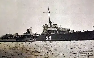 When World War II began in September, she was initially deployed in the German Bight where she laid defensive minefields. The ship then patrolled the Skagerrak to inspect neutral shipping for contraband goods.[6] On the night of 17/18 October, Rear Admiral (Konteradmiral) Günther Lütjens, aboard his flagship Z21 Wilhelm Heidkamp, led Z16 Friedrich Eckoldt, Z17 Diether von Roeder, Z18 Hans Lüdemann, Z19 Hermann Künne, and Z20 Karl Galster as they laid a minefield off the mouth of the River Humber. The British were unaware of the minefield's existence and lost seven ships totaling 25,825 gross register tons (GRT). On the night of 12/13 November Z21 Wilhelm Heidkamp, now the flagship of the Commander of Destroyers (Führer der Zerstörer), Kapitän zur See (Captain) Friedrich Bonte, escorted Z18 Hans Lüdemann, Z19 Hermann Künne, and Z20 Karl Galster as they laid 288 magnetic mines in the Thames estuary. Once again unaware of the minefield's existence, the British lost the destroyer Blanche and thirteen merchant ships displacing 48,728 GRT. On 1 December she began a refit at Stettin that lasted for three months.[7]