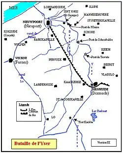 The Battle of the Yser took place in October 1914 along a 35 km (22 mi) long stretch of the Yser river and Yperlee canal in Belgium.[44] On 15 October c. 50,000 Belgian troops ended their retreat from Antwerp and took post between Nieuwpoort and French Fusiliers Marins at Diksmuide, which marked the end of the "Race to the Sea". Both sides conducted offensives and when the attacks by the Tenth Army and the BEF to Lille was defeated in early October, more French troops were sent to the north and formed the Détachement d'Armée de Belgique ("Army Detachment of Belgium") under the command of General Victor d'Urbal.[45] Falkenhayn assembled a new 4th Army from the III Reserve Corps, available since the fall of Antwerp and four new reserve corps, which had been raised in Germany in August and were deficient in training, weapons, equipment and leadership. The 4th Army offensive along the coast to St. Omer, began with operations against the Belgians, to drive them back from the Yser.[46]