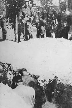The first execution of people of Bydgoszcz took place in the "Valley of Death" on 10 October 1939. The extermination action continued there until November 11,[88] and according to some sources, until 26 November 1939.[89] Victims were brought to the execution site by trucks, most often from places of imprisonment such as the Bydgoszcz Internierungslager. After being stripped of their outer clothing and valuables, the convicts were shot in the back of the head or, less frequently, by machine gun fire. The wounded were finished off with shots from pistols, rifle butts, or sometimes simply buried alive.[90] The execution squads consisted primarily of members of the Bydgoszcz Selbstschutz (led by SS-Sturmbannführers Spaarmann and Meier) and Fordon (the latter commanded by Friedrich Walther Gassmann), as well as Schutzstaffel men from the Bydgoszcz branch of Einsatzkommando 16.