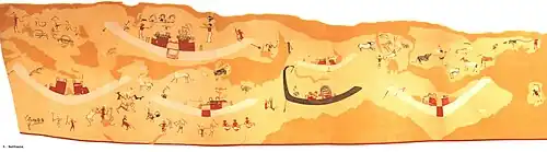 Several of the images in the mural resemble images seen in the Gebel el-Arak Knife: a figure between two lions, warriors, or boats,[25][26][27][28] but are not stylistically similar.