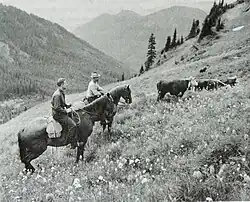 A U.S. Forest Service ranger and cattle grazer permittee on a hillside with cattle in Gifford Pinchot National Forest, Washington in 1949