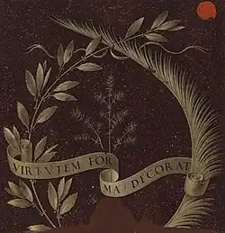 The imagery and text on the reverse of the panel—a juniper sprig encircled by a wreath of laurel and palm, memorialized by the Latin motto Virtvtem Forma Decorat ("Beauty adorns virtue")—further support the identification of the portrait. The phrase is understood as symbolizing the intricate relationship between Ginevra's intellectual and moral virtue on the one hand, and her physical beauty on the other. The sprig of juniper, encircled by laurel and palm, suggests her name. The laurel and palm are in the personal emblem of Bernardo Bembo, a Venetian ambassador to Florence whose platonic relationship with Ginevra is revealed in poems exchanged between them. Infrared examination has revealed Bembo's motto "Virtue and Honor" beneath Ginevra's [????], making it likely that Bembo was somehow involved in the commission of the portrait.