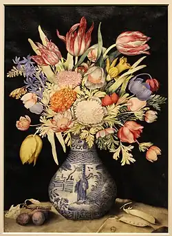 Giovanna Garzoni (1600 – February 1670) was an Italian Baroque painter. She began her career painting religious, mythological, and allegorical subjects but gained fame for her still life botanical subjects painted in tempera and watercolour.[2][3] Her works were praised for their precision and balance and for the exactitude of the objects depicted.[4] More recently, her paintings have been seen to have female bodily associations and proto-feminist sentiments.[5][6] She combined objects very inventively, including Asian porcelain, exotic seashells, and botanical specimens.[7] She was often called the Chaste Giovanna due to her vow to remain a virgin.[8] Scholars have speculated Garzoni may have been influenced by fellow botanical painter Jacopo Ligozzi[9] although details about Garzoni's training are unknown.