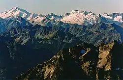 Glacier Peak Wilderness is a 566,057-acre (229,075 ha), 35-mile-long (56 km), 20-mile-wide (32 km) wilderness area located within portions of Chelan, Snohomish, and Skagit counties in the North Cascades of Washington. The area lies within parts of Wenatchee National Forest and Mount Baker National Forest and is characterized by heavily forested stream courses, steep-sided valleys, and dramatic glacier-crowned peaks.[2] The dominant geologic feature of the area is 10,541-foot (3,213 m) Glacier Peak. It is the most remote major volcanic peak in the Cascade Range and is the third most heavily glaciated volcano in the lower forty-eight states behind Mount Rainier and Mount Baker. Glacier Peak is a volcanic cone of basalt, pumice, and ash which erupted during periods of heavy glaciation.[3][4]