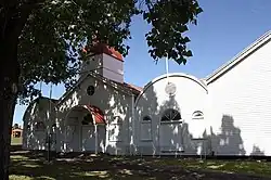 The main timber grandstand was completed and opened at the 1899 Armidale-Glen Innes Combined District Show. Built of hardwood and covered with corrugated iron, the main building had a ground surface of 58 by 30 feet; a height of 24 feet from plate to plate, giving a roof projection of five feet, with an ornamental front gable. The stand provided seating for 350 people. Designed by Sydney architects, Thompson and Holmes, the work was supervised by Glen Innes builder A. W. Lane.[8][1]