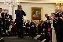 The event featured live performances from Jamie Barton, Gayle, Dave Grohl, Mickey Guyton, Herbie Hancock, Christopher Jackson, Ladama, Aimee Mann, Rakim, and Armani White, among others.[23] Blinken himself also performed "Hoochie Coochie Man" by Muddy Waters, the video of which went viral.[24][3][25] Quincy Jones, a former Jazz Ambassador, received the inaugural Peace Through Music Award.[4]