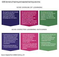 UNESCO developed a competency framework on GCE with key learning outcomes, learner attributes and learning objectives to help guide policymakers and curriculum developers in their efforts to develop national curricula that empower learners to assume active roles, both locally and globally.[1] This competency framework is based on a vision of learning that covers three domains to create a well-rounded learning experience: Cognitive, Socio-Emotional and Behavioural.[16] Although conceptually distinct, these three domains do not represent isolated learning processes; they often overlap, mutually reinforce and build upon each other, and can also occur in parallel. For example, socio-emotional learning (SEL) requires understanding existing challenges in the community (cognitive) and making informed decisions (behaviour).[1] By delivering lessons using all three domains, teachers are more likely to develop the broad range of knowledge, attitudes, values and behaviours that are expected of GCE. This approach also makes it possible to address the four pillars of learning that are key to ensuring learners are equipped with the skills they need to face the world as active and engaged citizens: Learning to know, to do, to be and to live together.[17]