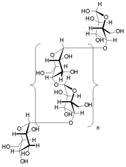 Glycogen is a branched biopolymer consisting of linear chains of glucose residues with an average chain length of approximately 8–12 glucose units and 2,000-60,000 residues per one molecule of glycogen.[20][21]