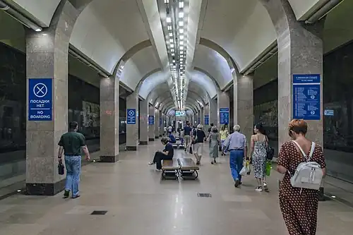 Gorkovskaya (Russian: Горьковская) is a station on the Nizhny Novgorod Metro and is the northern terminus on the Avtozavodskaya line. It opened on November 4, 2012. It is also the only station on the right bank of the Oka River in the historic Upper City section of Nizhny Novgorod. The station is named for Gorky Square, under which the station is situated. Maxim Gorky was born in Nizhny Novgorod and the city was itself named Gorky until 1990.