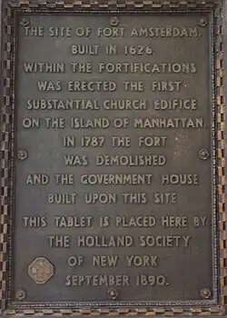 On September 29, 1890, the Holland Society of New York installed a commemorative tablet at 4 Bowling Green. It described that the Government House was built on the site of Fort Amsterdam, built in 1626.[29]