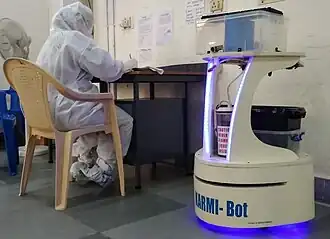 The robot named ‘KARMI-Bot’ is used to assist patients at the medical college's COVID-19 isolation ward. The robot developed by ASIMOV Robotics, was donated to medical college by famous actor Mohanlal. The robot has fully autonomous features for dispensing food & water, disinfection, collecting trash and other features like video call.