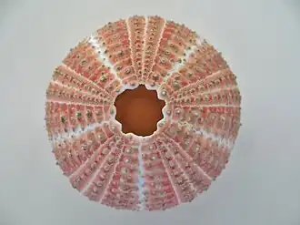 The species in this genus are regular sea urchins, with a rounded test, bearing the anus at the top and the mouth at the bottom. They are extremely similar to species in the genus Echinus, but are differentiated by a primary tubercle on every interambulacral plate.[1]