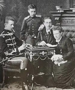 The grand duke was a lifelong bachelor, never involved in scandals. In his memoirs, his cousin Grand Duke Alexander Mikhailovich recalled that he was "a confirmed and enthusiastic woman-hater",[7] then a term used for misogynists but also homosexuals. That Dimitry had close affectionate relationships with the female members of his family suggests the latter. He was adored by his family and especially by his young nieces and nephews, with whom he would happily play and ride for hours.[8] He was particularly close to the children of his brother Konstantin. His nephew Prince Gabriel Konstantinovich remembered him, as a "wonderful, kind person" who was almost a second father and wherever they saw him, they ran across the room, jumping up to hug him and wrap their arms around his neck. Dmitry Konstantinovich also loved to tease the children and play practical jokes on them.
