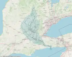 With a watershed area of 7,000 square kilometres (2,700 sq mi), the Grand River flows from Dundalk to Lake Erie with numerous tributaries flowing into it:[13]