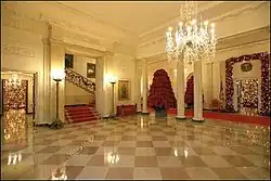 A stair carpet in a shade of red has been used since the administration of Theodore Roosevelt. During the Kennedy restoration, the carpet was made deeper, more crimson. A mahogany pier table with gilded caryatid supports attributed to New York cabinetmaker Charles-Honoré Lannuier is located at the bottom of the stair. Portraits of 20th century presidents and first ladies hang on the walls. An English cut crystal chandelier of the mid-19th century hangs over the first landing.[9] In 1998 Hillary Clinton working with then Curator of the White House Betty Monkman refurbished the Grand Staircase. A new carpet for the Grand Staircase and the Cross Hall was designed incorporating a border of laurel leaves and five pointed stars within a circle, a motif found in Winslow's carved marble Truman era string course entablature and in the balusters of the Grand Staircase. A more vivid red was selected, and several shaded of yellow gold. New swag and jabot drapery in the same red and yellow-gold colors were made for the staircase and Entrance Hall.[10]