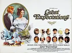 Great Expectations is a 1974 film made for television based on the Charles Dickens 1861 novel of the same name. It was directed by Joseph Hardy, with screenwriter Sherman Yellen and music by Maurice Jarre, starring Michael York as Pip, Simon Gipps-Kent as Young Pip and Sarah Miles as Estella. The production, for Transcontinental Films and ITC, was made for US television and released to cinemas in the UK. It broke with tradition by having the same actress (the thirty-three-year-old Sarah Miles) play both the younger and older Estella. The film was shot by Freddie Young. It was filmed in Eastmancolor and it was entered into the 9th Moscow International Film Festival in 1975.[3]