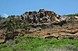 A unique feature of Great Sandy National Park is the coloured sands, which are formed by old sand mixed with clay into a consolidated mass. The visible hues include red, brown, and yellow, which are a reflection of the iron-rich minerals embedded in the sands for thousands of years and brought to the surface by wind and water eroding the land.[9]