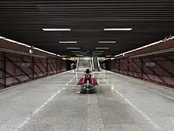 Initially, the station had a grey-blue colour scheme where the lighter floor and central pillars contrasted with the darker side walls. The floor is made out of grey granite, the pillars are rectangular and covered with greenish panels, the ceiling is linear, made of aluminium, the railings are made of aluminium as well and the walls are synthetic and were painted blue.