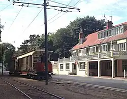 The station was the first terminus of the line in 1893, the following year an extension was opened as far as Laxey and the station became an intermediate one. The building that still occupies the site, consisting of a large open waiting shelter incorporating small ticket office in one corner, dates from the beginning of the railway, but has been unstaffed for many years save for occasional special events. Despite its somewhat basic appearance and lack of facilities, the station was one of the most popular on the line, serving the glen which operated as pleasure grounds, the adjacent hotel and nearby narrow gauge railway. The hill figure next to it reading "GROUDLE" was placed next to the shelter in 1993 for the centenary celebrations, a similar sign featured on the opposite hillside prior to the growth of trees planted for the glen's opening. The site is illuminated for evening service by two lamps affixed to the traction poles of the railway, unusually in brown to match the station rather than traditional green. One of the tramway's electrical sub-stations is a short distance from the stop just prior to the curve which leads to Groudle Viaduct. Beside what is now the entrance to the glen once stood Dobie's refreshment room, the site is now occupied by a private dwelling.