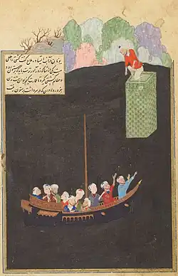 There follow the words illustrated in the Persian miniature, believed to be by the Mughal painter Govardhan, shown at the top of the article:[7]