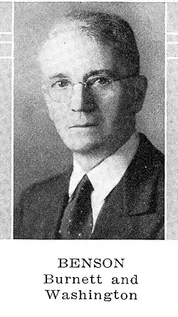 Benson was born on April 18, 1876, in Jordan, Wisconsin.[1] He attended the University of Wisconsin. He married Anna Holtz in 1903.[2] He died in Phoenix, Arizona in 1958 and was buried in Spooner, Wisconsin.[2][3]