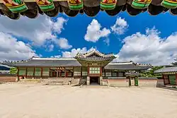 One of the main buildings used for the education of the crown prince.[153] It was first built in 1427. It was destroyed in 1592 and rebuilt in 1865.[154] It was again destroyed in the 1867 fire, and was rebuilt by 1888.[155] In 1914, the building was sold and later reassembled in the private home of a Japanese businessman Ōkura Kihachirō in Tokyo.[156] It was destroyed in the 1923 Great Kantō earthquake.[155] Its remains were returned to Korea around 1996,[157] and are now on display near Geoncheonggung.[158] In 2001, Jaseondang was rebuilt on its original spot.[159] |