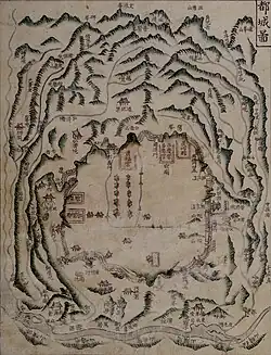 The placement of both Gyeongbokgung and Hanyang considered both practicality and various philosophical traditions.[84] The capital needed to have good access to water transportation, adequate spaces for roads to the rest of Korea, and adequate space for farming.[85] For philosophical traditions, one factor used from the Chinese text Rites of Zhou was placing the ancestral temple on the left, and soil and grain temple on the right. Accordingly, Jongmyo is to the left of the palace and Sajikdan to the right.[86] Another factor from the Rites was placing government offices to the front of the palace and markets to the rear; only the offices were able to be placed like so, as there wasn't enough room behind the palace for markets.[87] Feng shui was also considered. The flow of Korea's mountains and watersheds was analyzed, with one goal being to have the palace with a mountain behind it and water to the front. This corresponds to Bugaksan, Cheonggyecheon, and the Han River.[88] The presence of four surrounding major mountains (Bugaksan, Naksan, Inwangsan, and Namsan[b]) in Hanyang was seen as auspicious and protecting the city. Hanyang also had an outer ring of surrounding mountains (Bukhansan, Achasan, Gwanaksan, and Deogyangsan[c]), adding to its auspiciousness.[89] Contemporary Korean Buddhist monks then considered the convergence point of three mountains and two rivers to be auspicious sites: Hanyang had Samgaksan, Yongmunsan, and Gwanaksan and the confluence of the rivers Bukhan and Namhan.[91]