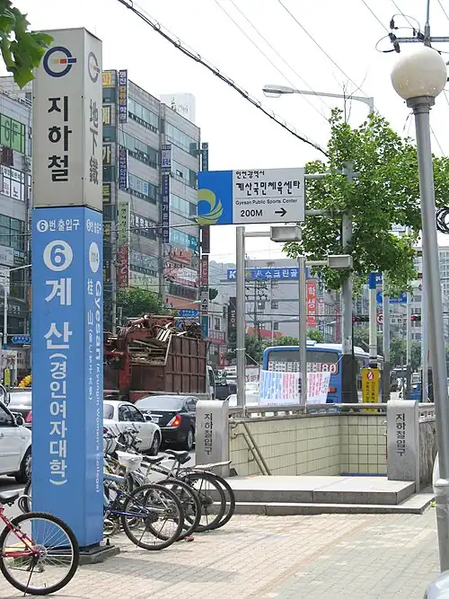 Gyesan station (Korean: 계산역; Hanja: 桂山驛) is a subway station on Line 1 of the Incheon Subway located at Gyesan 1,2 dong, Gyeyang District, Incheon. The station is nearby Kyung-in Women's College.
