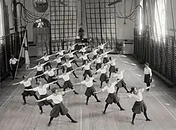 The Federation of International Gymnastics (FIG) was founded in Liege in 1881.[15] By the end of the nineteenth century, men's gymnastics competition was popular enough to be included in the first modern Olympic Games, in 1896.[16] From then until the early 1950s, both national and international competitions involved a changing variety of exercises gathered under the rubric, gymnastics, which included, for example, synchronized team floor calisthenics, rope climbing, high jumping, running, and horizontal ladder. During the 1920s, women organized and participated in gymnastics events. Elin Falk revolutionized how gymnastics was taught in Swedish schools between 1910 and 1932.[17] The first women's Olympic competition was limited, involving only synchronized calisthenics and track and field. These games were held in 1928 in Amsterdam.