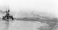 In February 1915, Majestic was assigned to participate in the upcoming Dardanelles Campaign to open the Turkish Straits, and she departed early that month under the command of Captain H. F. G. Talbot to join the Mediterranean Fleet. Upon arriving at Malta, she was fitted with what was termed "mine-catching" gear[3] so that she could serve as a "mine-bumper".[8] She joined the Dardanelles force on 24 February 1915, and on 26 February 1915 departed Tenedos to bombard the Ottoman Turkish inner forts at the Dardanelles that morning.[3] On 26 February 1915, Majestic and battleships Albion and Triumph became the first Allied heavy ships to enter the Turkish Straits during the campaign, firing on the inner forts from 0914 until 1740 hours. Majestic took a hit below the waterline, but was able to continue operations and patrolled the area again on 27 February 1915. She supported the early landings, shelling the forts from 1125 until 1645 hours on 1 March 1915 and again while patrolling on 3 March 1915. She arrived at Mudros on 8 March 1915.[3]