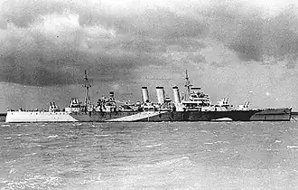 In July 1931, Norfolk and Devonshire were the first British Navy ships to visit the German harbour Kiel. In September 1931, the crew of the Norfolk were part of a mutiny that later became known as the Invergordon Mutiny.[8] The ship later served with the Home Fleet until 1932 and was then Flagship of the 8th Cruiser Squadron on the America and West Indies Station, based at the Royal Naval Dockyard on Ireland Island in the Imperial fortress colony of Bermuda, between 1932 and 1934. Norfolk left Bermuda on 21 November 1934 for England.[9] From 1935 to 1939, Norfolk served with the Commander-in-Chief, East Indies, before coming home to refit in 1939, being still in dockyard hands when war was declared.[10]