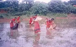 The Hajongs have a very rich culture. Hajong culture has greatly influenced and has had a tremendous impact on the language, clothing, and culture of other tribes like the Koches of Meghalaya, Banais, and Dalus. Hajong women can be easily identified by their brightly striped red dress called Pathin. Traditionally, and in many present-day villages, women are accomplished weavers who weave their own dresses.[34] The Hajongs make it compulsory for every woman to know the art of weaving, which is regarded as a qualification for a woman for marriage.[35] The Hajongs are a group of agrarian people, most of their cultural practices, folklore and traditions are related to their agricultural practices. Hajongs are skilled in woodwork and basketry, they make all of their farming tools and household items themselves. In addition to the implements needed for rice farming, Hajong households have many bamboo fishing implements.[36]