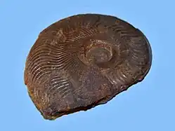 Harpoceratinae is an extinct subfamily of cephalopods belonging to the family Hildoceratidae. Ammonites of this subfamily had involute and compressed shells with strong keels. Keel might be rarely missing, but this is considered to be an abnormality. This has been observed both in Cleviceras and Harpoceras and called as genus Monestieria, which is now known to be invalid (into this invalid genus were added also abnormal unkeeled specimens of genus Protogrammoceras). Another example is Pseudolioceras, whose unkeeled specimen was used as type for description of invalid genus Praehaploceras. Oxyconic forms of this subfamily (Polyplectus and Sphenarpites) does not have any keel. Ribs were single, but in some genera also bifurcating with shapes from sigmoidal to falcate. Sometimes, shell can have only striate ribs or is smooth (Sphenarpites and older specimens of Eleganticeras and Ovaticeras). Tubercules are rare. Dimorphism is known in some genera and it is observable mostly in size. Macrochons can be 4, to 6 times larger than microconchs. As an example, macroconchs of Pseudolioceras are more than 150mm in diameter, while adult microconchs are only 35-50mm. There are big size differences even within dimorphs. Specimens ca be 2, or sometimes even 3 times bigger than other specimens of same dimorph.[1]