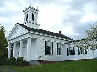 What is now Hill Street in rural central northern Suffield was laid out in 1726 along a north–south ridge, and was historically part of one of the main routes between Windsor, Connecticut and Springfield, Massachusetts. The area developed in part over religious differences: Joseph Hastings began opposing Congregationalist teachings and practices as early as 1740, and was ordained a Baptist minister. Their church, built at Hill and Russell where the present 1842 Greek Revival church now stands, was one of the first Baptist congregations to be established in Connecticut. This became the nexus for a small village, in which the Hastings house (still standing next to the church) served as a tavern for travelers, and a blacksmith and shop were located across the triangular green at the street corner. In the early 20th century a local barn was adapted for use as a summer theater venue, lasting until World War II.[2]