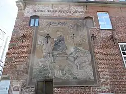 After the great fire in Oldenburg, the building was constructed in 1682 as a merchant's house on the Lange Straße.[2] For 135 years it belonged to the Grovermann family. In 1828, it was bought by Hinrich Lebrecht Kirchhoff. In 1838, the tobacco manufacturer Johann Karl Propping acquired the property. Propping built a tobacco factory designed by the architect Klingenberg. The house changed hands several times in the 1890s until it was bought by the Hoyer brewery. The house became a restaurant and hotel in 1894 and was named "Graf Anton Günther".[3] Professor August Oetken created the large exterior fresco of Count Anton Günther on his horse, Kranich.[2]